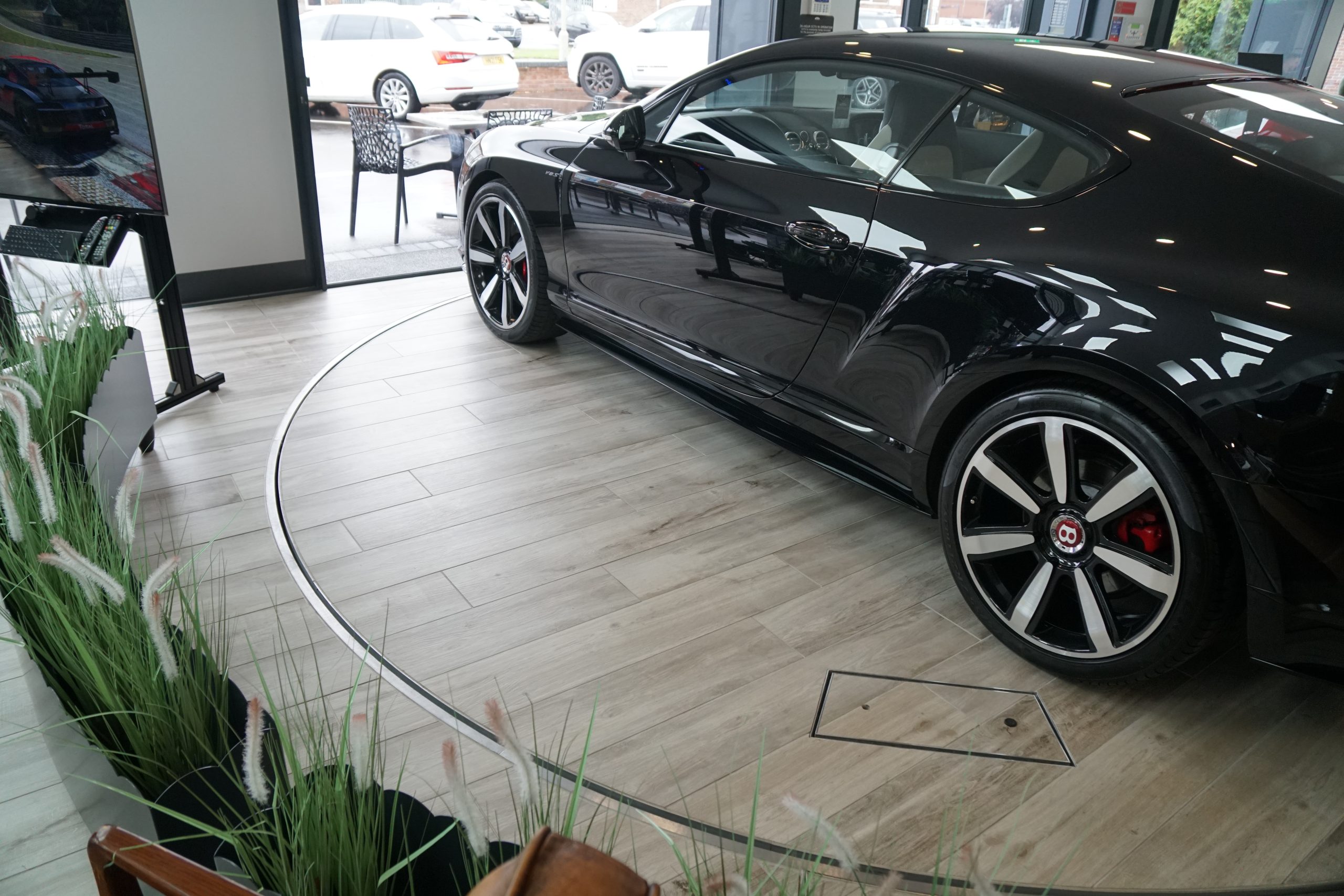 “​We lowered the whole floor & incorporated turntables with lighting effects. To ensure maximum visibility from the street scene & access for the vehicles, we designed a series of large, interactive sliding glass panels.”